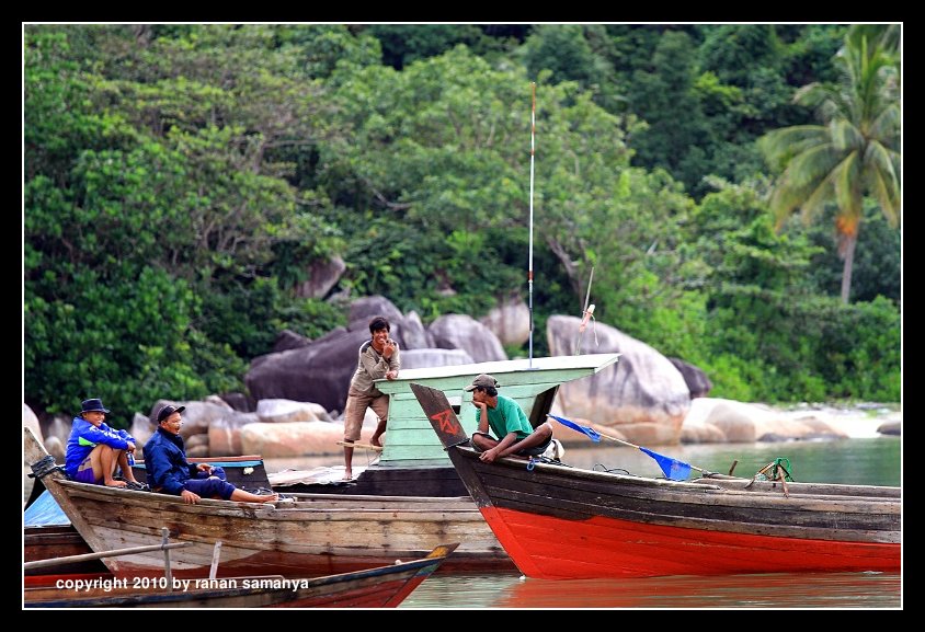 Fishermen gathered and gossiping on their boats in the afternoon, while waiting to go to the sea again. Segiling Village, Bintan.
