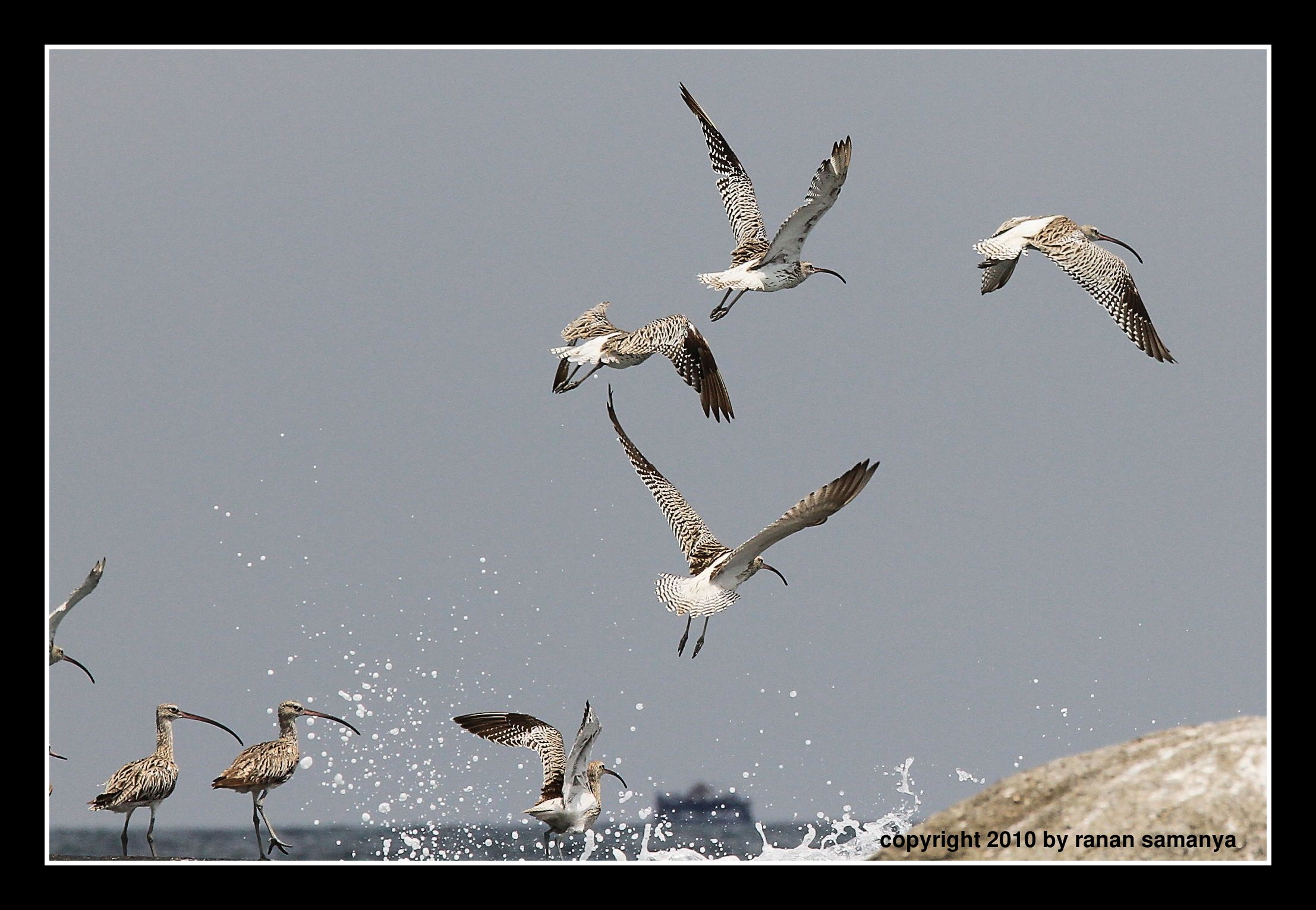 Here’s another short note from yesterday’s survey. I love the curvature formation when they started to fly one by one, showing different wings position. The first one was taken against the sun, thus the rather plain white background. The second one was better as the sun was behind me. I like the splash of the sea, although the big rock could have been eliminated (but then we won’t have the splash, will we?).