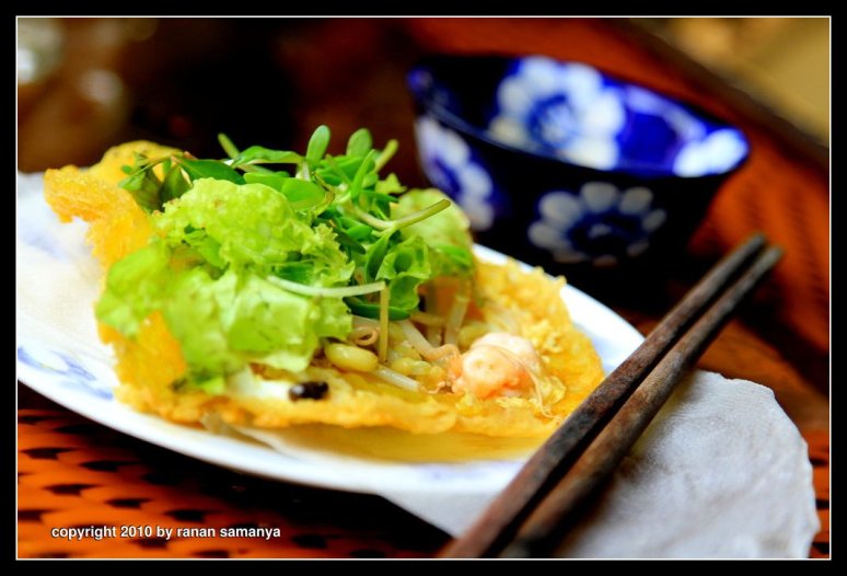 Crispy, savoury, and mint. That’s how it taste. Bánh xèo in English means sizzling cake. Although it varies from region to region, basically it is a deep fried rice-flour pancake with bean sprouts and a choice of meat (usually pork) or shrimp or both. Top it with lettuce and other fresh crispy greens. Fold it in two, then use the thin rice paper wrapper to wrap around it. Dip it in the dip sauce (another savoury mix of fish sauce, salted soy beans, lime and other exotic ingredients).