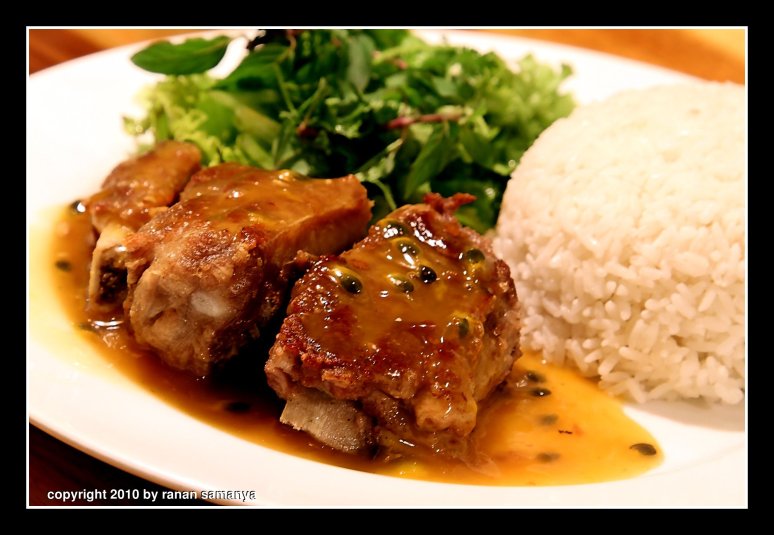 I always prefer pork whenever it is available and nice. In a small restaurant in Hanoi, Vietnam, they serve this strange mix of pork ribs in passion fruit sauce. Intrigued, because I do like both pork ribs and passion fruit, I ordered it. And it was a darn good choice. The pork ribs were crispy on the outside, and tenderly well done and juicy on the inside. And I couldn’t help imagining the size of the pig that they cut, looking to the size of the ribs! Anyway the gelatinous passion fruit sauce really add that exotic taste that I can not explain. It’s so… so… passionate!