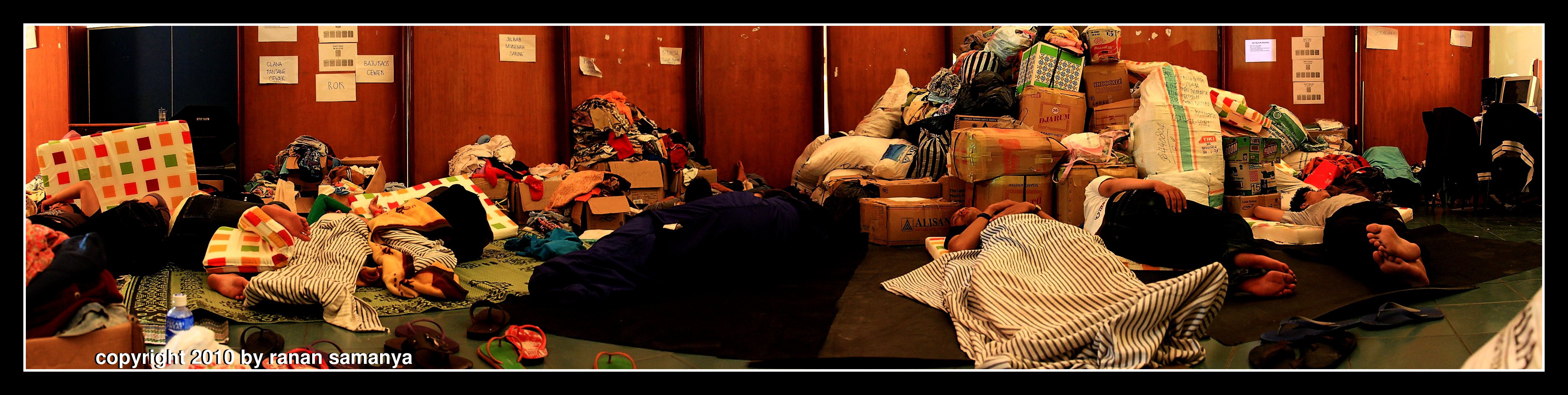 Really, this is how we, volunteers, sleep in STIE YKPN Yogyakarta (well a few prefer to sleep outside, they are usually the evening shift group). What a mess. And it keeps on changing every night. The piles behind us are donated clothes. Yes, this is actually the dry logistic section. On the other side of the auditorium door is the medical and bottled water logistic section, while the raw food section is in a separate room.
