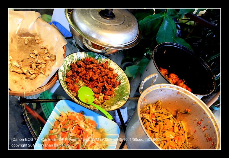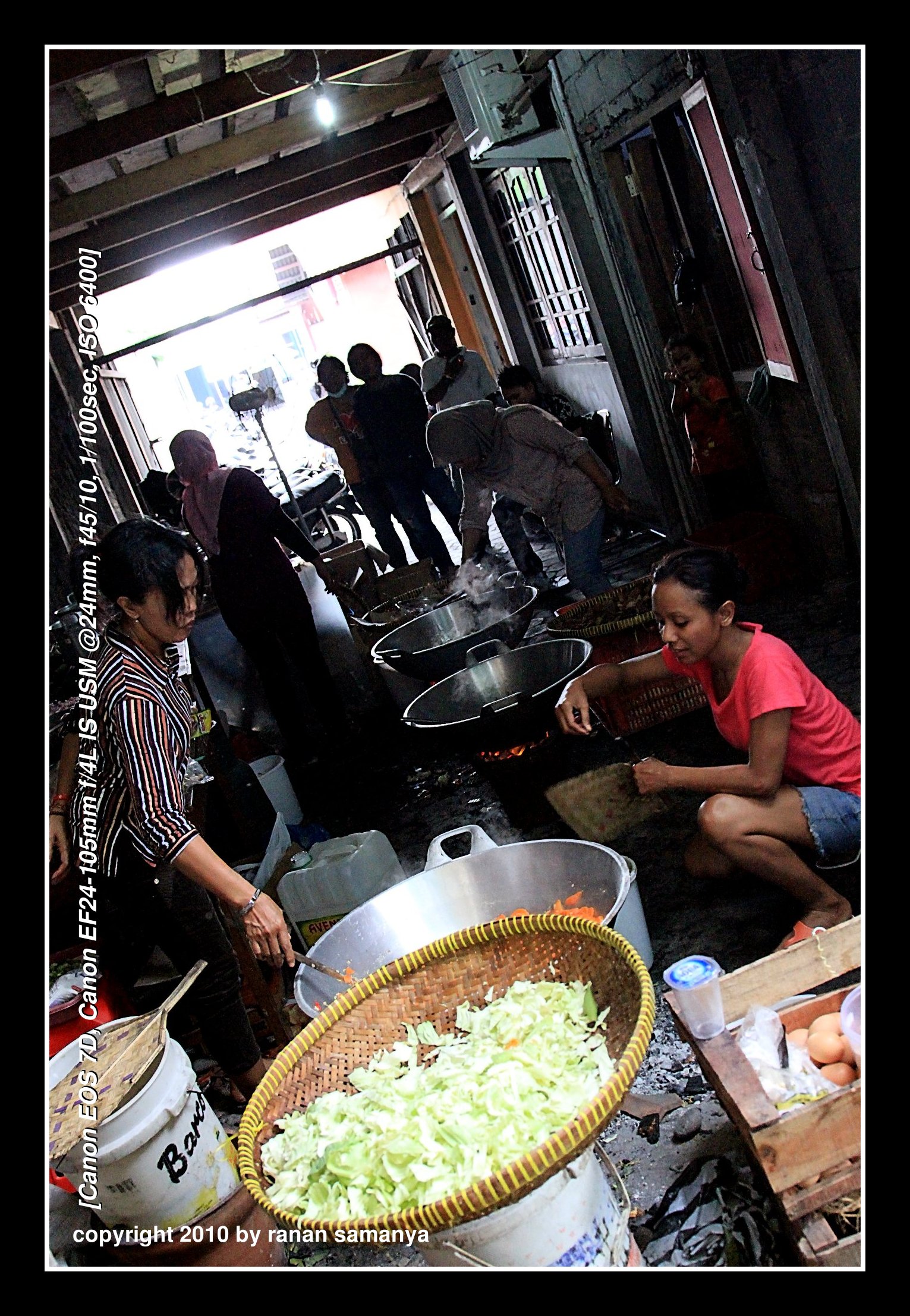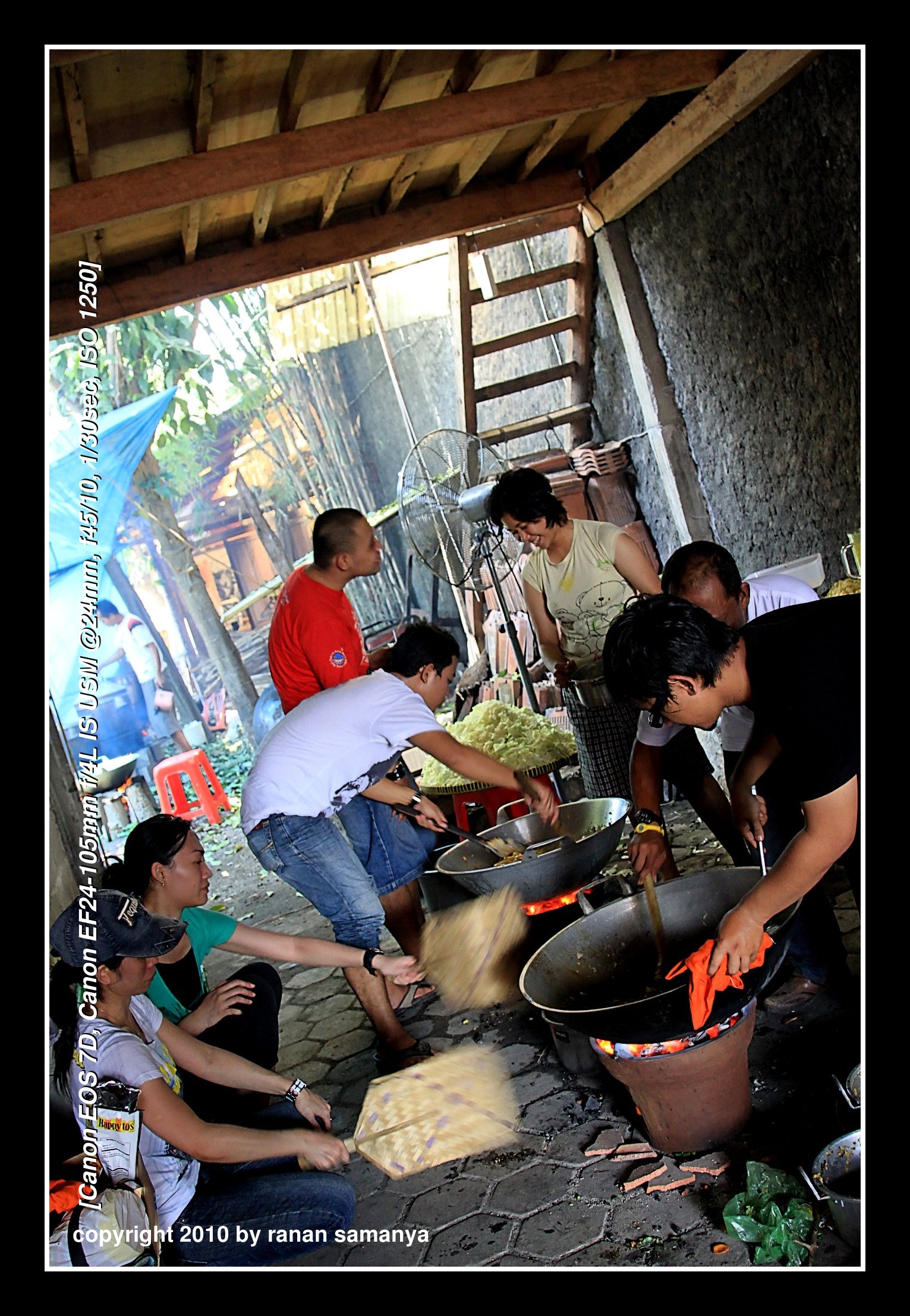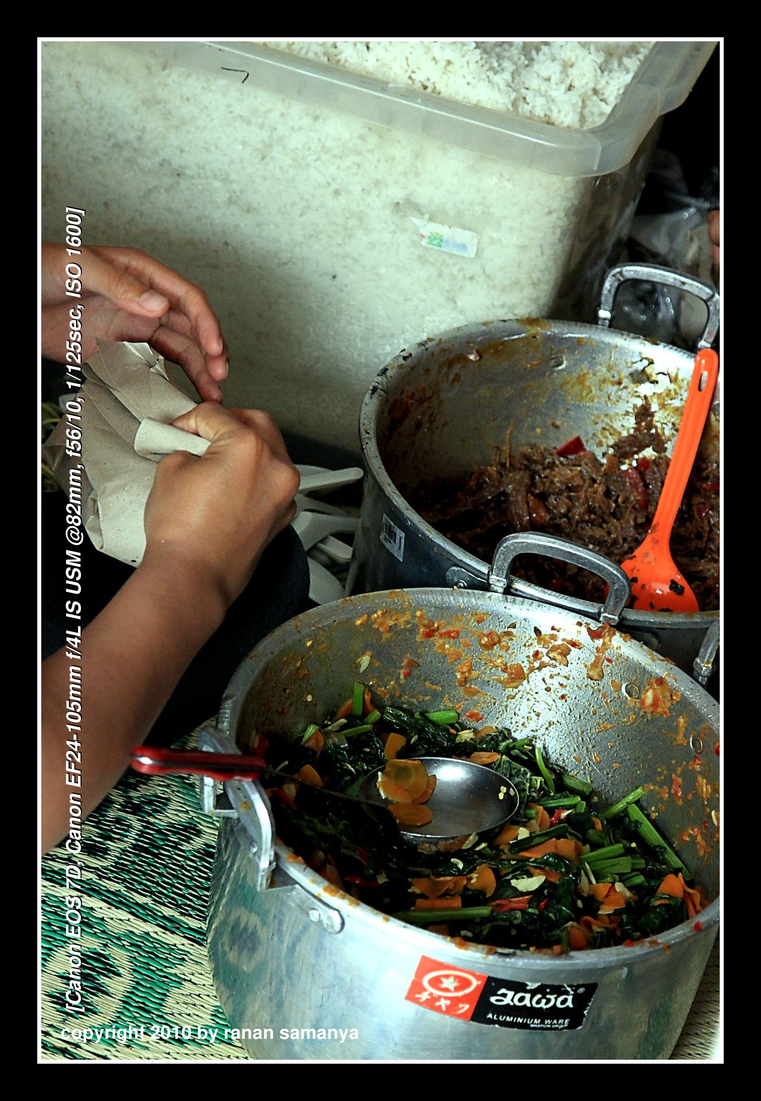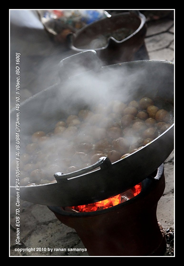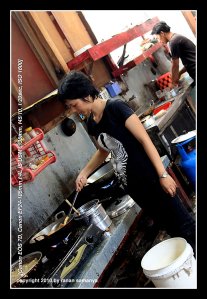 Two LPG stoves with two fire points each, a few charcoal stoves, and four or five BIG firewood stoves to cook rice. Each of this gargantuan stove can cook 25kg of rice in one time. They were so huge that stirring could only be done using gargantuan spatula that looked like a paddle.
