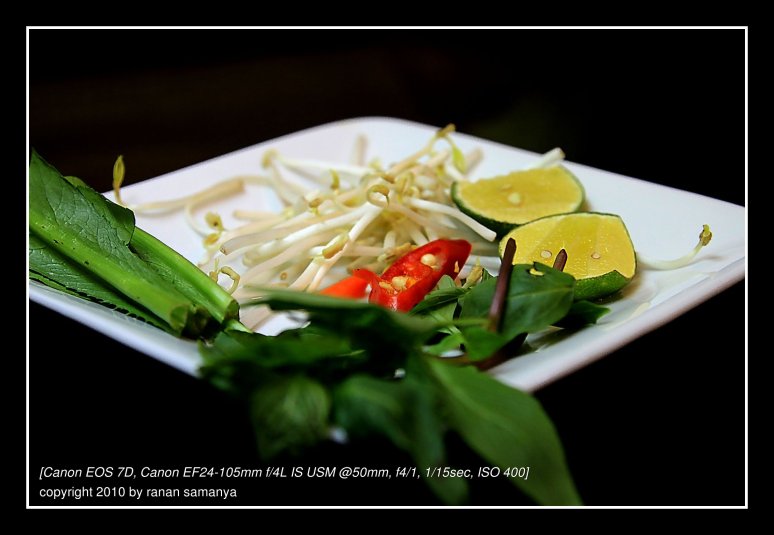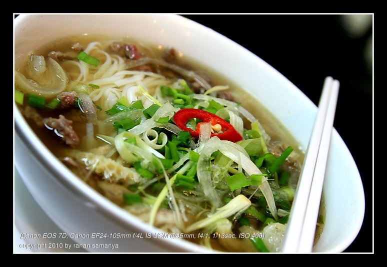 When in Vietnam we have got to try its traditional noodle soup, phở. So on one starving day, I entered what seemed to be a crowded local pho resto in Hanoi. Only after ordering did I realize it was one of the Pho24 chain, with more than 5 outlets in Jakarta alone! Nonetheless, the food arrived, and it was satisfying. The place was clean and the plates were shining, just like Frommer’s review said. It has got plenty of noodles and assorted beef cuts, and the side dish consisted of fresh basil, bean-sprouts and one other unidentified leaves. The meat could be done more tenderly, but hungry hath all the fury, and the bowl was completely empty after 10 minutes.