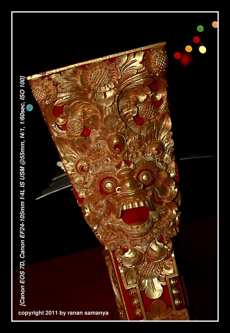 A 60 degree tilted external flash in M mode was used. Yes, manual mode, as this is the only mode my old speedlite can work with the 7D. The soft flash highlighted the carvings while not making them too bright such that the gold colour remained.