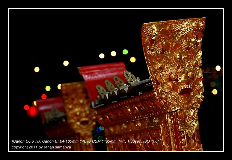 I love decorative lights. They provide colours to otherwise black and empty backgrounds in night photos. Like here with these Balinese gamelan ready for a stage performance. The lights were hanging in front of a restaurant approximately 20m away. My movement area was tight as I took the pictures from in between the decoration for the stage.