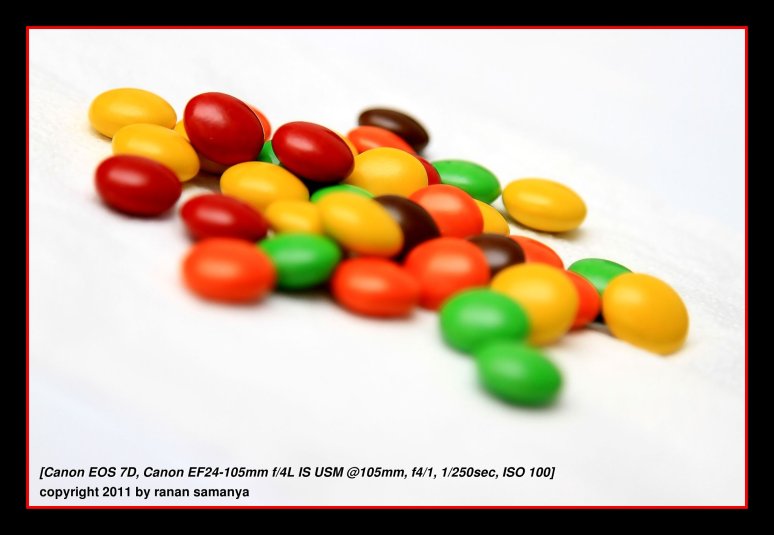 OK, it’s not a studio. It’s my living room. An unused bedside table. A few sheets of used paper, and mmm… toilet paper! Poured down two packs of chocolate candy. Zoomed in to maximum and wide open so the paper borders were so out of focus, and the flash added the uniform white although it was not (I didn’t even have to move the unused candies off the table). Speedlite 430EZ flash was in manual mode, stopped down 2/3 stops, bounced off the ceiling. Oh, and manual focus.
