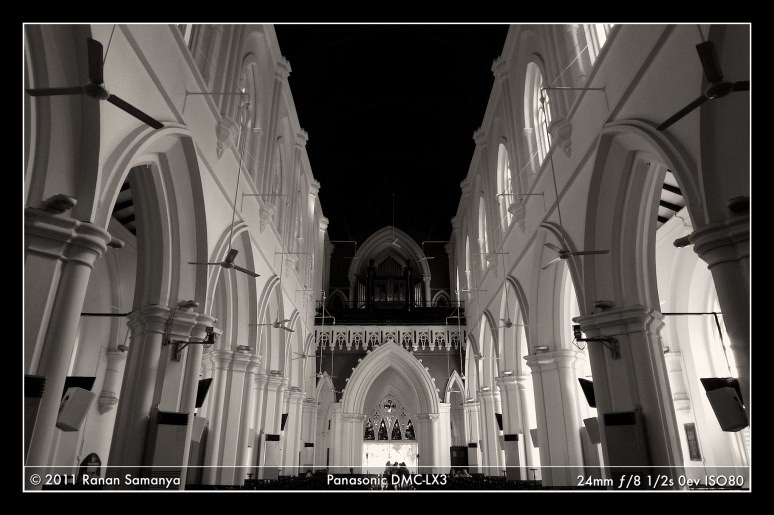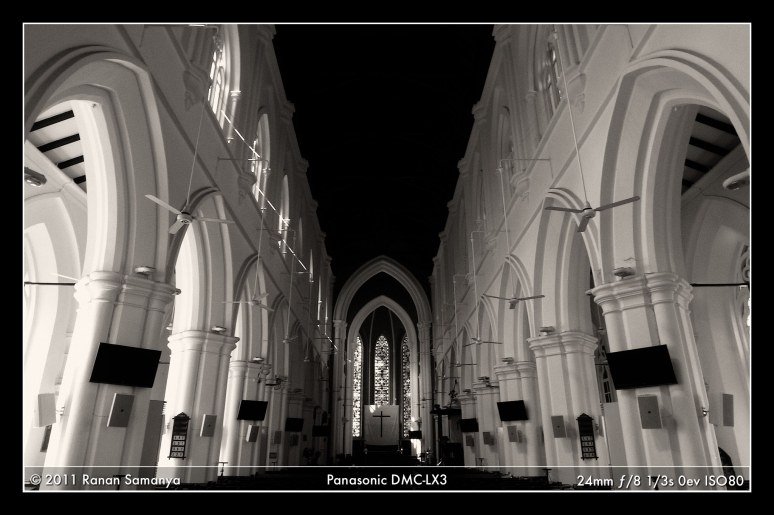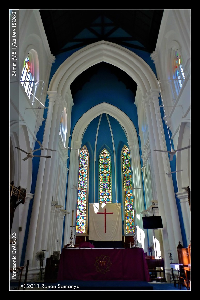 This is the perfect time to revisit the classic St. Andrew’s Cathedral Singapore. Here are five frames from the interior of the 147 years old Anglican Cathedral as promised last month. I really like the contrast of the deep blue ceiling and the white pillars. The altar stood in front of nicely decorated tall stained glass windows. I was lucky to arrive when the sun was shining through them. The benches are still that of old rattan and wood. The shelves are full of bibles and hymn praises in different languages (I saw Mandarin and German beside English), neatly stacked. The sides of the benches, as well as the front walls, are full of memories of loved ones.