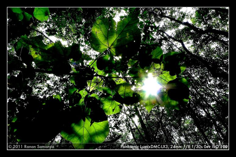 Here I used the broad leaves of Hibiscus tiliaceus (local: waru) against the afternoon sun to get the transparent vivid green colour showing the veins of the leaves.