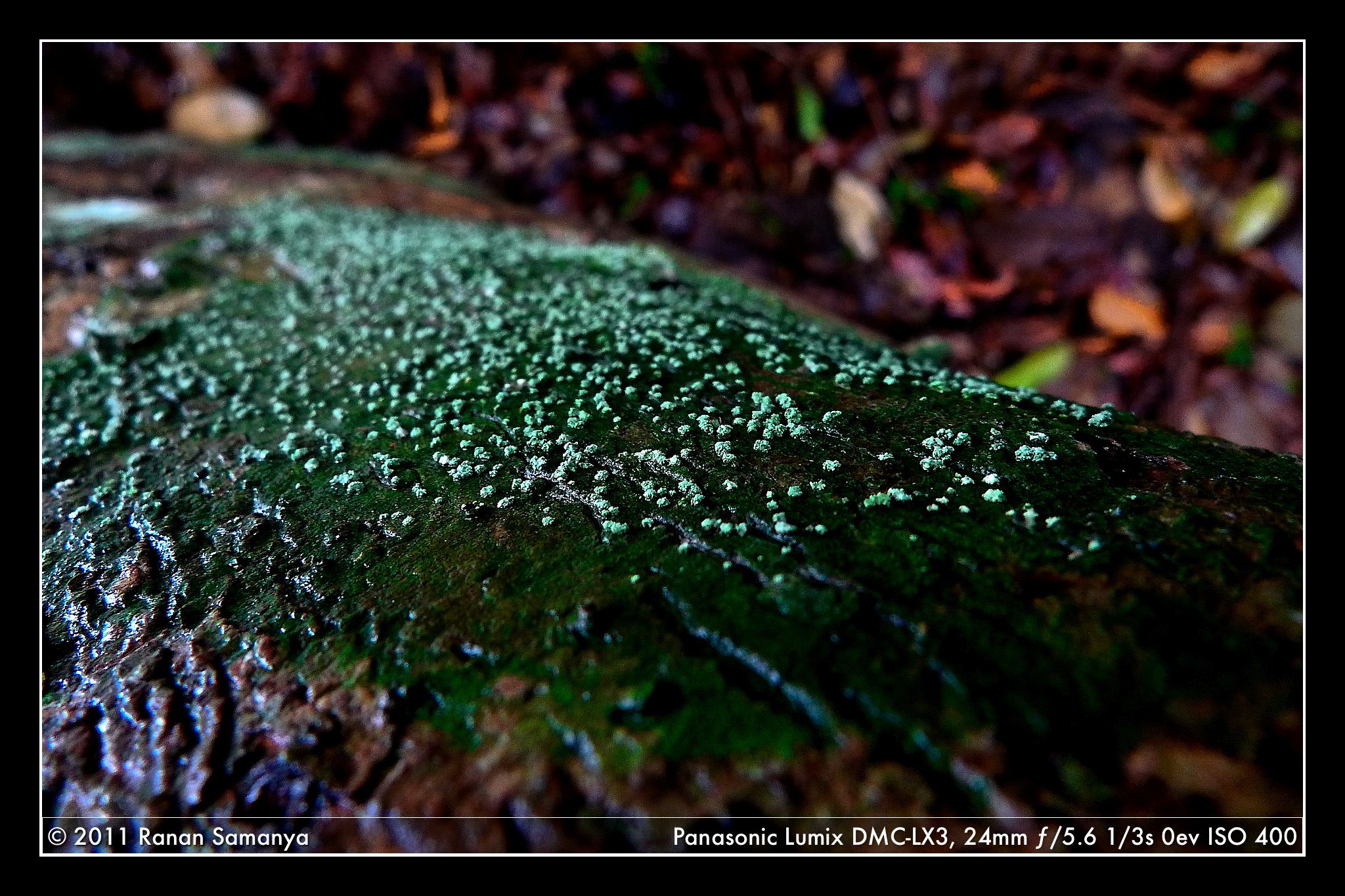 My LX-3 lens frame was literally sitting on the spores (and left a mark seen in the second picture) to get the minimum distance possible (1cm) with the macro mode (dangerous move, indeed, risking those spores to get into my lens). I also used the manual focusing mode (can’t seem to get a good focus with spot mode).