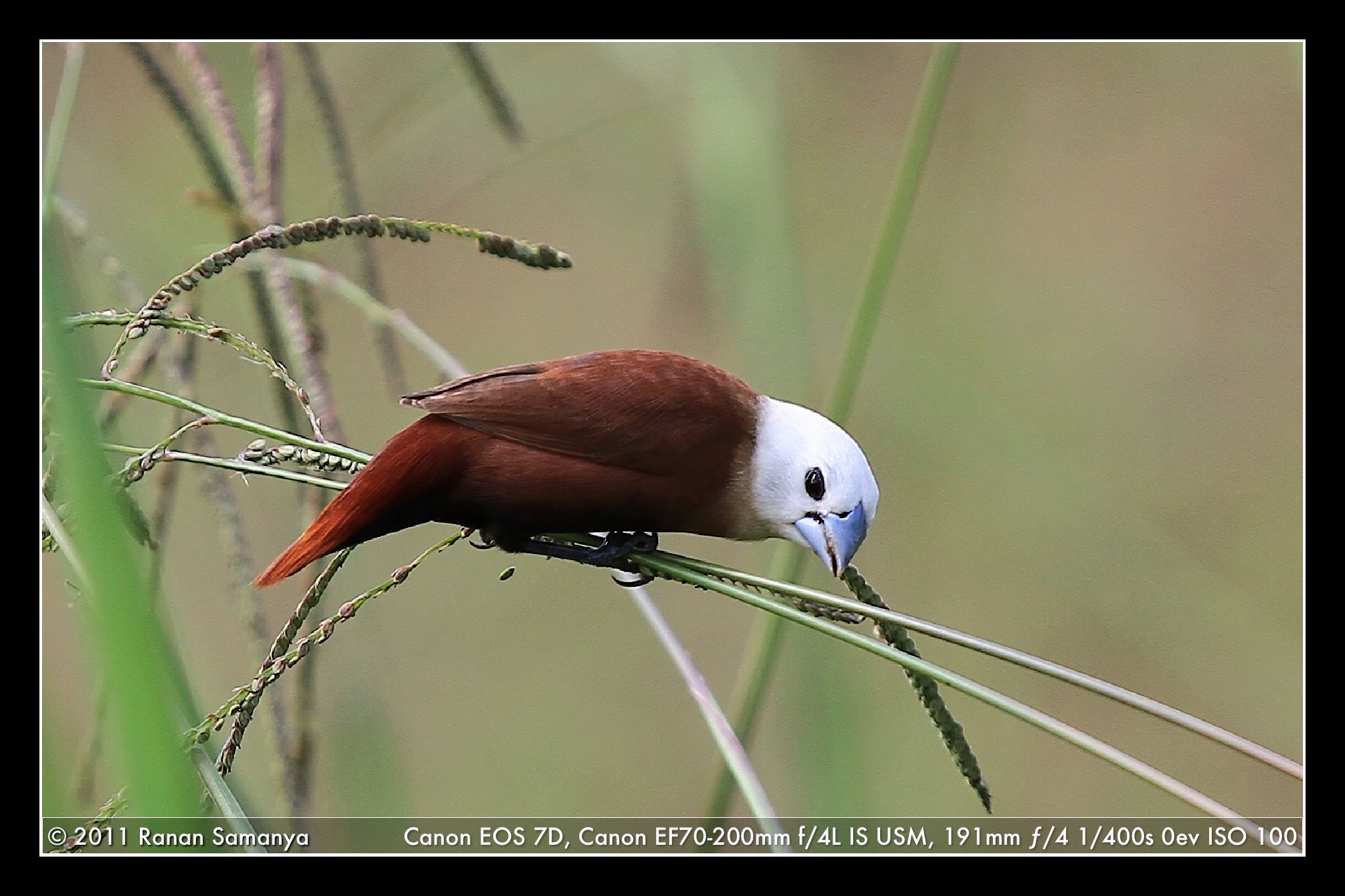 A very short and quick note: I was finishing a field inspection at our sanitary landfill this afternoon when I spotted two estrildid finches having their lunch on wild reed. Quickly changed my 24-105mm at the back of the car, and took a few shots. This finch belong to the species Lonchura maja (Indonesian: pipit haji; pipit bondol; bondol haji). One of the beautiful feature of this bird is the copper-brown upper tail-coverts.