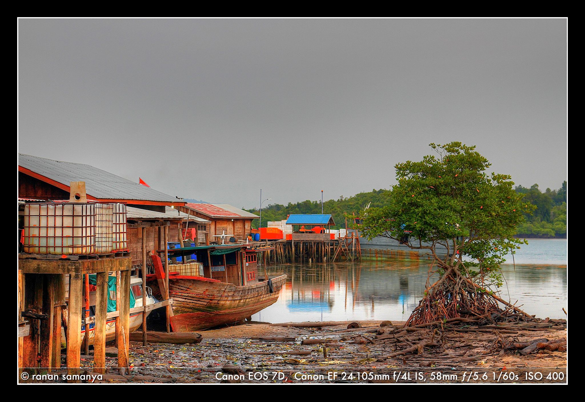 During low tide, the hidden trash is more prominent, but they are mostly organic such as dead logs and broken branches. Freshwater is close to non-existant here, so people buy from other island 30 minutes away by boat and store in big containers like this one on the left. Another HDR of 3 frames.