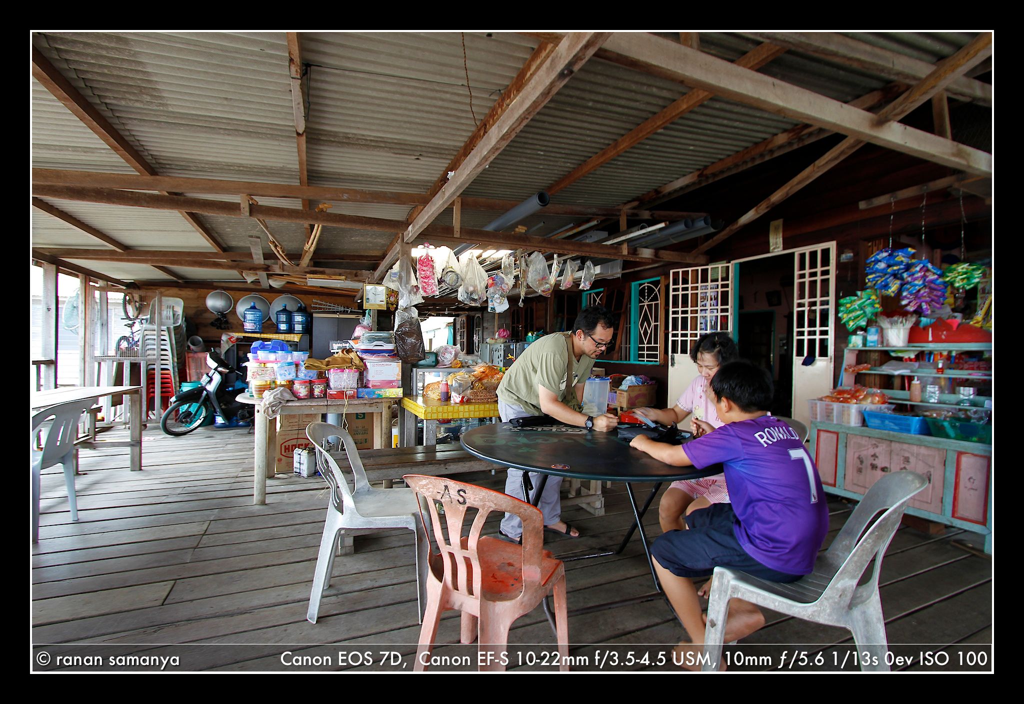 A Sui's super duper shop is strategically located at the left side of the passenger jetty. There is ample space for a gathering which happens almost every evening; people will drink coffee and play cards or dominoes. The view to the open sea is a little bit spoiled by the chicken wire fencing, but this fence also prohibit people from throwing rubbish to the sea.