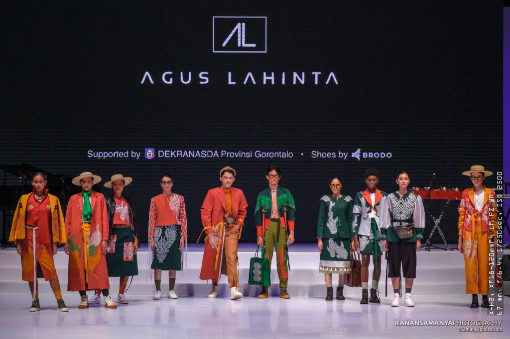 This is Gorontalo! If this is your first time hearing it, Gorontalo is a province in the norhtern part of Sulawesi (Celebes) Island. Indonesia Fashion Week 2023 opening day showcased two talented designers from this region, each brought along uniqueness. The first to appear was Agus Lahinta. He brought along outfits under Odu Olo theme, a Gorontalo language which means thank you. Terracota, green and mustard colours were dominant in his creation, with lovely patterns such as whale, tatudi flower and maleo bird decorating them.